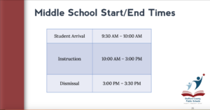Middle school students would begin school between 9:30 and 10 a.m., instead of the normal 7:45 a.m., and be dismissed between 3 and 3:30 p.m., instead of the normal 2:50 p.m. High schoolers, on the other hand, would start school at between 10:30 and 11:00 a.m., instead of the normal 7:40 a.m., and be dismissed between 4:15 and 4:45 p.m., instead of 2:15 p.m.