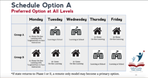 Under the return to learning plan, each grade level would have different schedules and implementations, depending on if they are doing both in-person and virtual or completely virtual learning. Those doing the hybrid plan follow ‘schedule A,’ which splits students into groups A and B, and has those groups physically and virtually attending school on different days of the week.