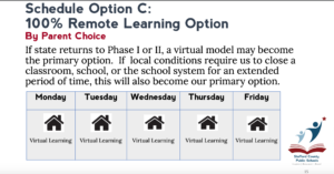 “If the state returns to Phase I or II, a virtual model may become the primary option. If local conditions require us to close a classroom, school, or the school system for an extended period of time, this will also become our primary option,” stated Superintendent Kizner’s presentation.