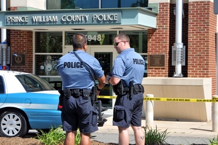 Police officers in Woodbridge roped off the Gar-Field District Station on Donald Curtis Drive after it sustained damage during Tuesday afternoon’s earthquake. Building inspectors were called to the building to make sure it is structurally sound. (Mary Davidson/PotomacLocal.com)