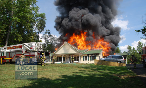 Fire and rescue crews from Stafford, Quantico, Dumfries and Woodbridge were called about 2:40 p.m. to an adult group home on Whispering Pines Lane in Stafford County, just off Shelton Shop Road, where a fire engulfed an entire structure.