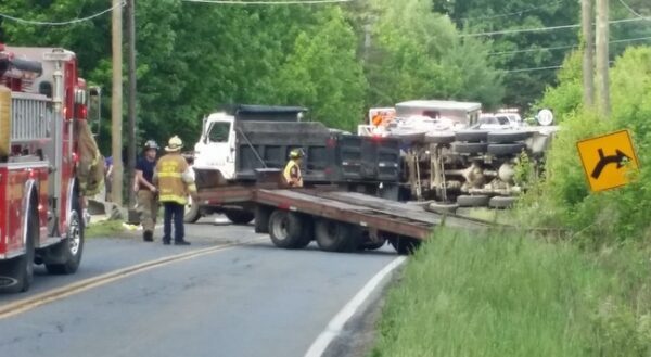 A fuel tank on one of the dump trucks ruptured. A nearby sand a gravel business provided free sand to emergency crews tasked with cleaning up the fuel spill.