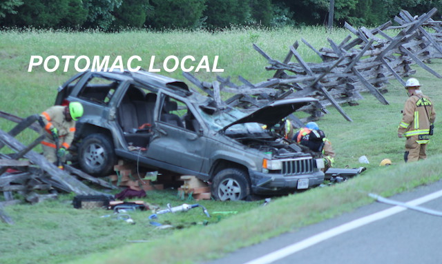 The single-vehicle crash involved a Jeep SUV that appears to have run off the side of the road and landed on a wooden fence. At least three people were trapped inside the SUV and had to be pulled from the wreckage.