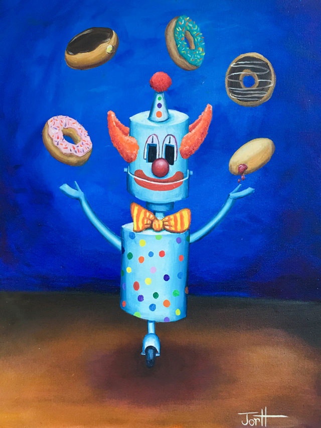 A Carnival of the Absurd features new paintings that blend themes of the carnival sideshow, Sunday morning cartoons, conspiracy theory and just plain weirdness in a way that only John can present them. Hartt’s oddball style can be described as a mix of lowbrow art, pop surrealism, and cartoonism.
