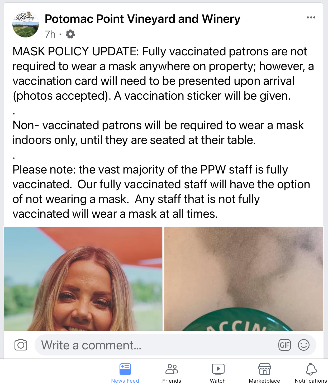 My wife and I have been costumers of Potomac point since their opening and love the atmosphere and, of course, the excellent wine selections. I also understand that they are a private business and can set their own rules as it relates to mask wearing. However, we also have the right and obligation to take our business elsewhere if we disagree with this policy. We will visit the winery once we don’t have to violate medical privacy laws.