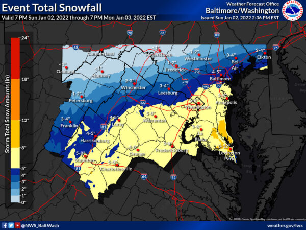 News Schools closed Monday as storm to bring 5 to 8 inches of snow By Potomac Local News Published January 2, 2022 at 3:16PM | Updated January 2, 2022 at 4:39PM Forecasters at the National Weather Service call for five to eight inches of snow to fall on January 3, 2022. [Image: The National Weather Service] This article is FREE to read. Please Sign In or Create a FREE Account. Thank you. Author Potomac Local News View all posts #News