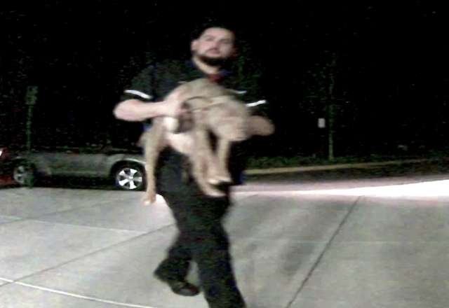 Video surveillance shows, at 12:34 a.m., a light-colored SUV parked in front of the center entrance. A man is then seen exiting the vehicle carrying a dog, identified as a tri-colored female Pitbull between one and two years old.