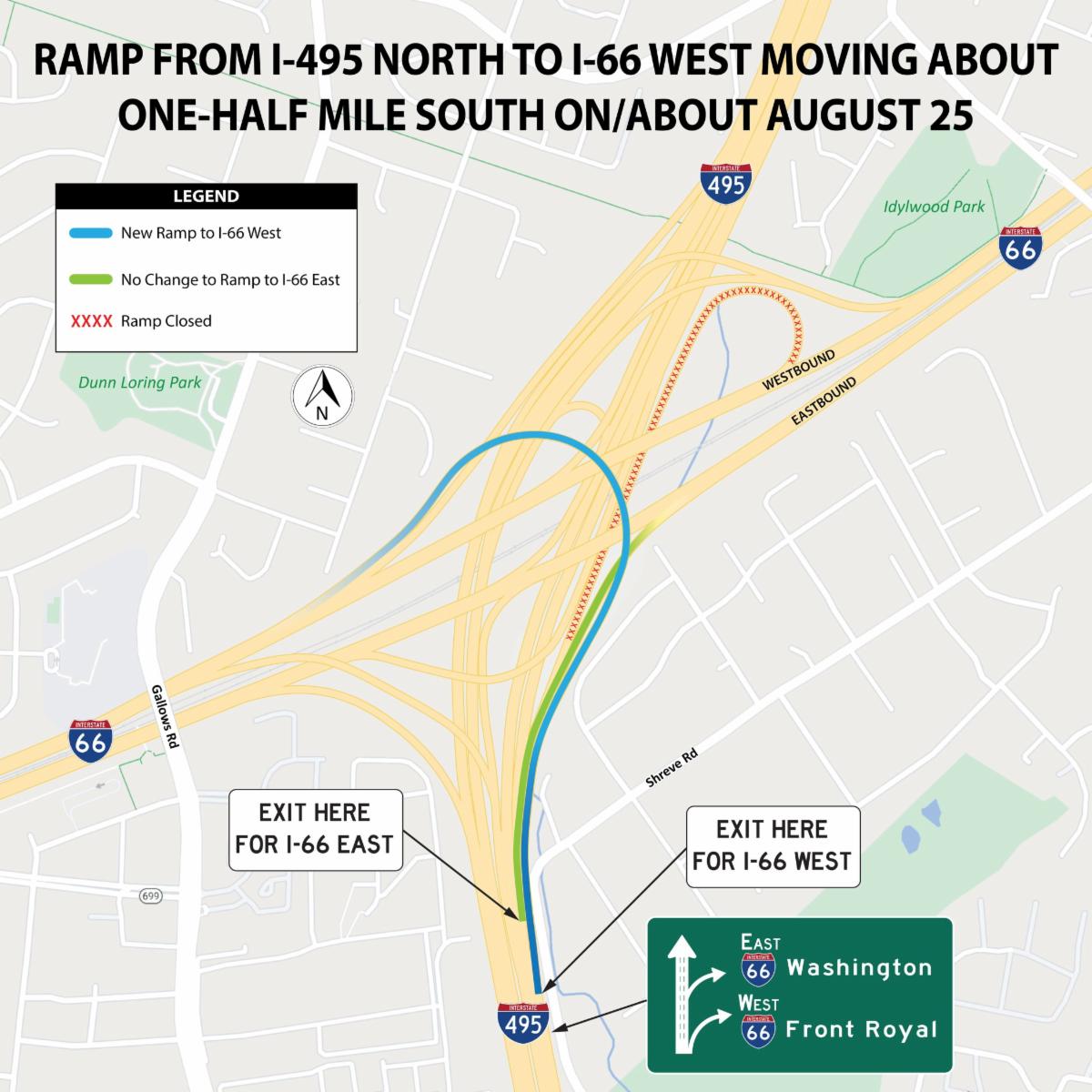 Drivers on northbound I-495 heading to westbound I-66 will use a new flyover ramp, located one-half mile south of (prior to) the old exit ramp, and prior to the ramp heading to eastbound I-66. Once this new ramp opens, the old exit ramp that ran under and then looped onto I-66 West will close to allow construction of new ramp connections at the I-66/I-495 interchange.