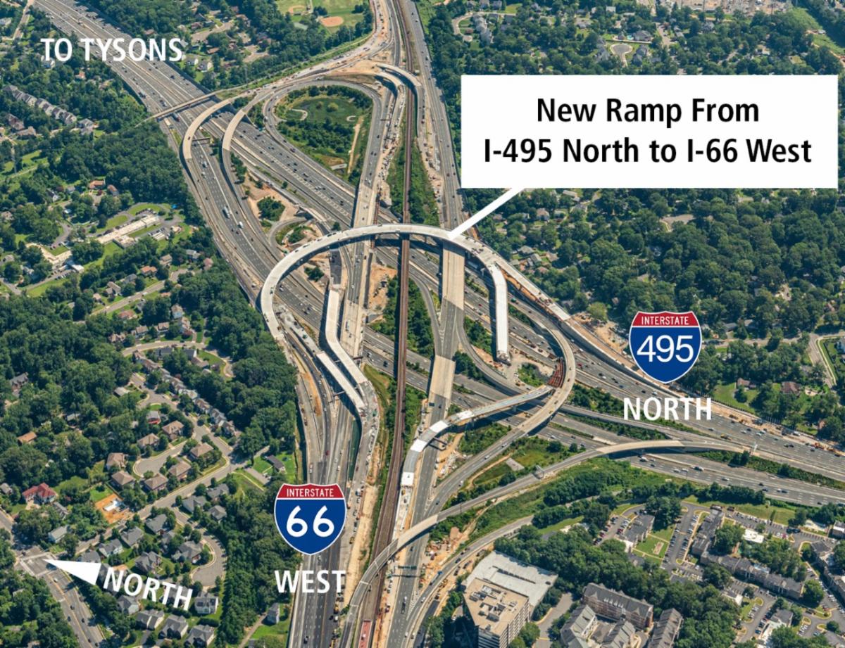 The location of the ramp from I-495 North to I-66 East will not change as part of this new configuration.