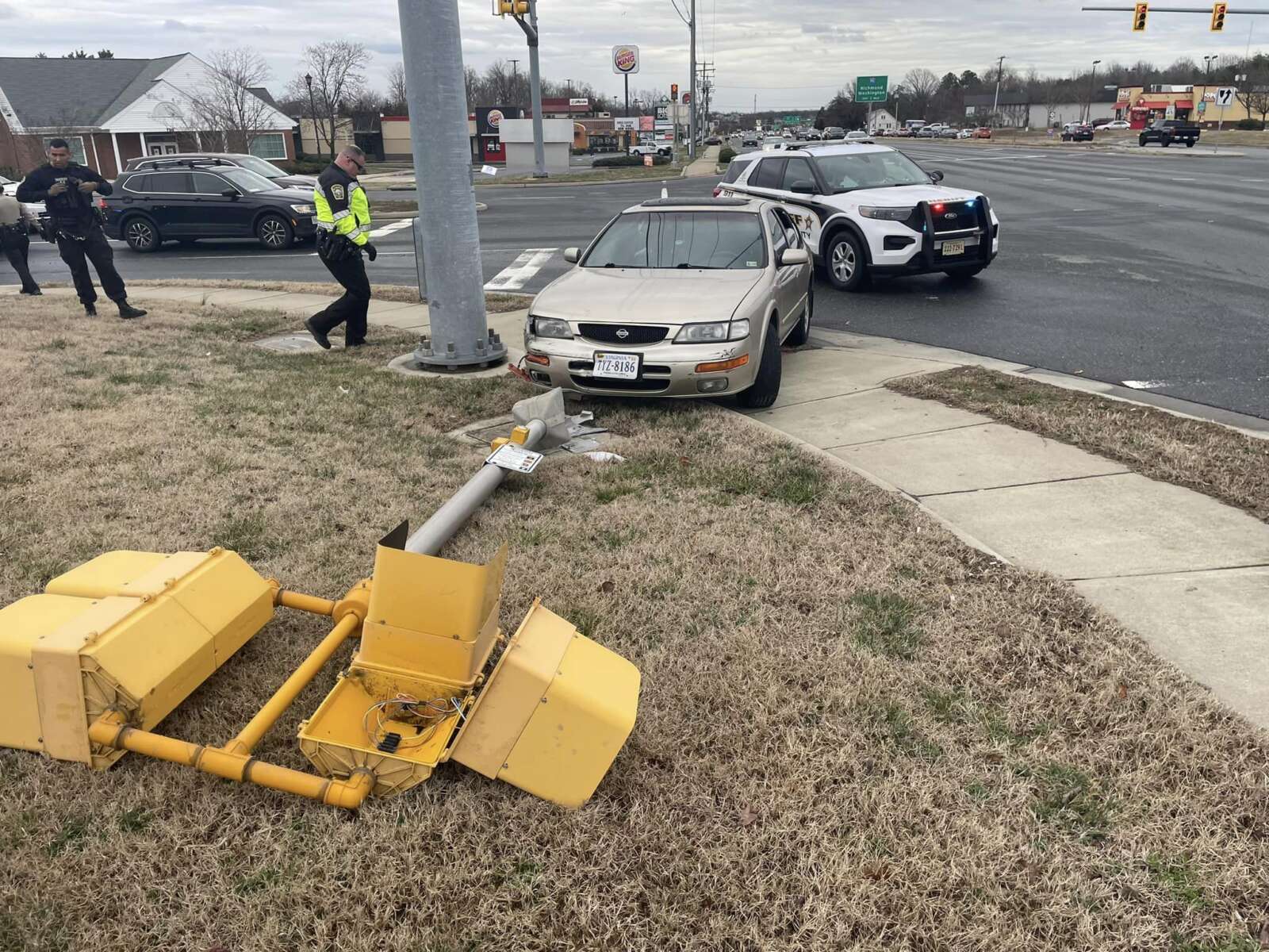 As Deputy Gordon realized the driver had active warrants, the driver shifted the vehicle into gear and police followed. The suspect proceeded northbound onto Warrenton Road and disregarded two red traffic signals. Unable to negotiate the intersection at Plantation Drive, the suspect ran off the road and crashed into a crosswalk signal, ending the vehicle pursuit.