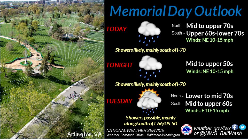 National Weather Service Baltimore-Washington: “Another day of clouds, rain showers, and below normal temperatures can be expected as low pressure remains to the south. The greater concentration of showers will be over central Virginia and southern Maryland today. Rain chances persist through at least Tuesday.”