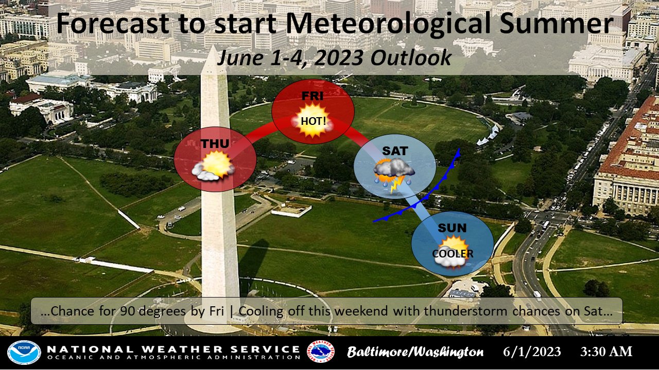 National Weather Service Baltimore-Washington: “June 1 [today] marks the start of Meteorological Summer, which runs between June 1st-August 31. Expect a warm-up to near 90 degrees by Fri before a backdoor cold front moves through Sat. This will increase shower chances on Sat with a marked cool down by Sun.”