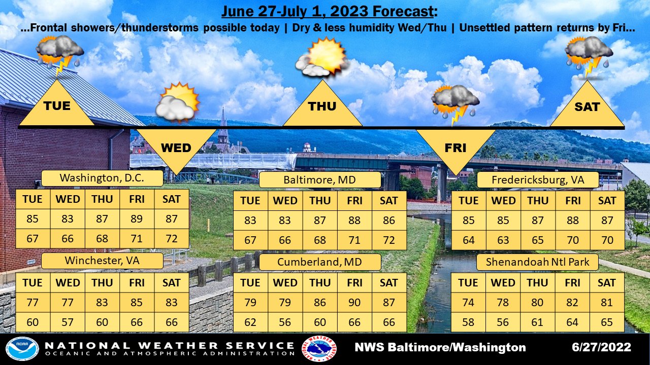 National Weather Service Baltimore-Washington: “As a slow-moving cold front tracks through, there will be a lingering thunderstorm threat. A few may become severe along and east of I-95. Expect drier conditions with less humidity on Wed/Thu before a return to a summertime pattern by Fri. ”