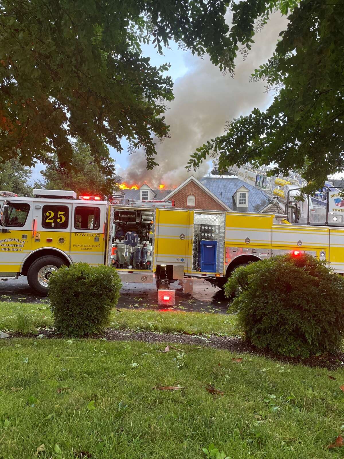Prince William fire and rescue: “Yesterday evening [Monday, August 7, 2023], units were dispatched to the 8000 blk of Montour Heights Drive (Gainesville) for a reported townhome on fire. The home’s occupants had smelled smoke and were searching the home when heavy smoke was discovered in the attic. Crews arrived with fire showing and spreading to an adjoining home. Fire attack quickly extinguished the flames. No injuries reported. One residence sustained extensive damage, while the adjoining home suffered smoke and water damage. Both homes were posted unsafe to occupy by the Building Official. Two (2) adults were displaced. The Fire Marshal’s Office determined a lightning strike ignited the fire.”
