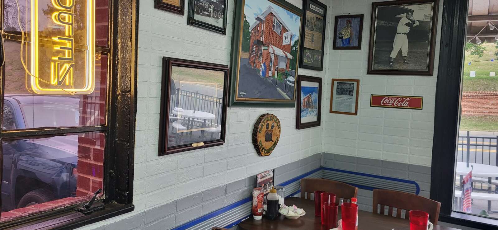 The Battlefield Restaurant sits near the city’s downtown, across the street from the Fredericksburg Battlefield Visitors Center, and next to a Civil War relic store. It’s on a stretch of Lafayette Boulevard known as “deadman’s curve” because of the number of car crashes, said Myers. There is a collection of pictures and paintings on the wall donated by residents, including a few paintings of the restaurant by John W. Edwards, a regular at the men’s table.