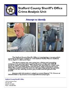 The Stafford County Sheriff’s Office needs your help identifying this individual involved in a recent larceny in Stafford Market Place. If you have any information, please reach out to Deputy Croson.