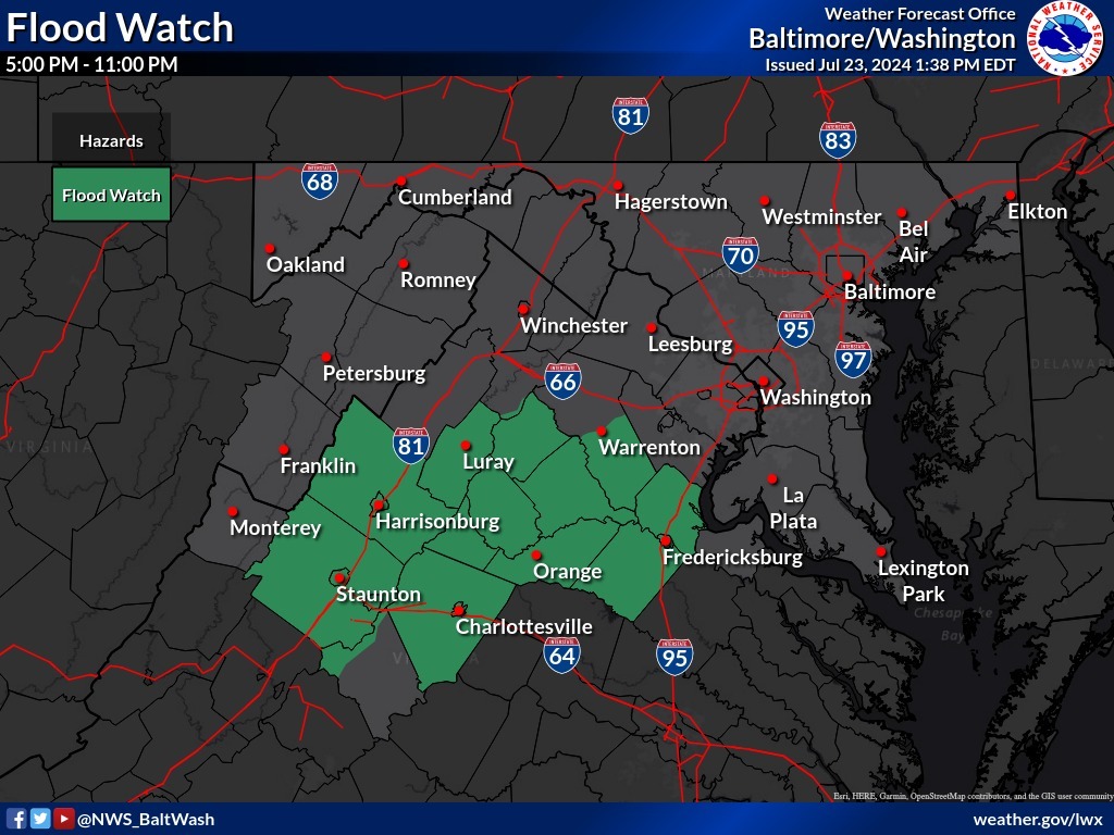 The flood watch covers parts of central, northern, northwest, and western Virginia, including Albemarle, Central Virginia Blue Ridge, Greene, Orange, Spotsylvania, Culpeper, Southern Fauquier, Madison, Northern Virginia Blue Ridge, Page, Rappahannock, Augusta, and Rockingham.