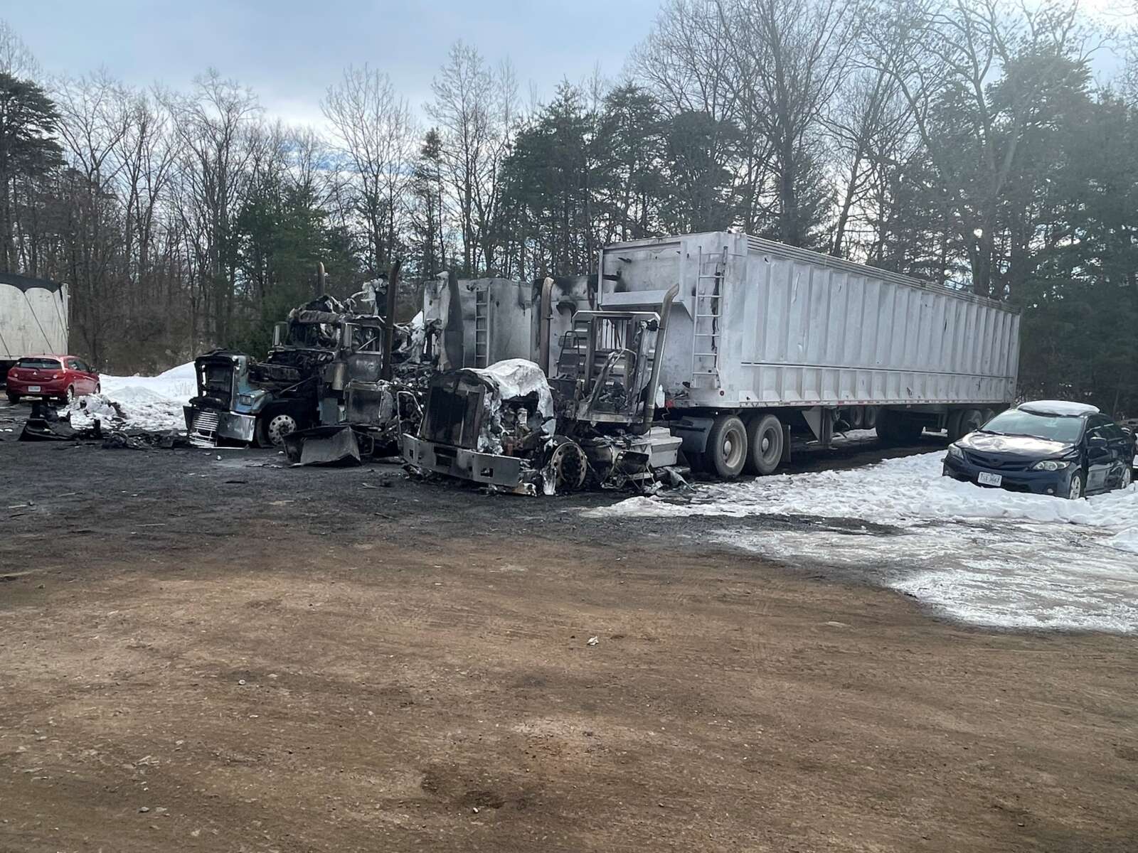 Crews were called to the 15000 block of Lee Highway in Gainesville late Thursday night for a vehicle fire. When they arrived, three tractor-trailers were ablaze. Firefighters utilized tanker operations to extinguish the flames, but the damage was extensive—three trucks were completely destroyed, and one connected trailer was heavily damaged.