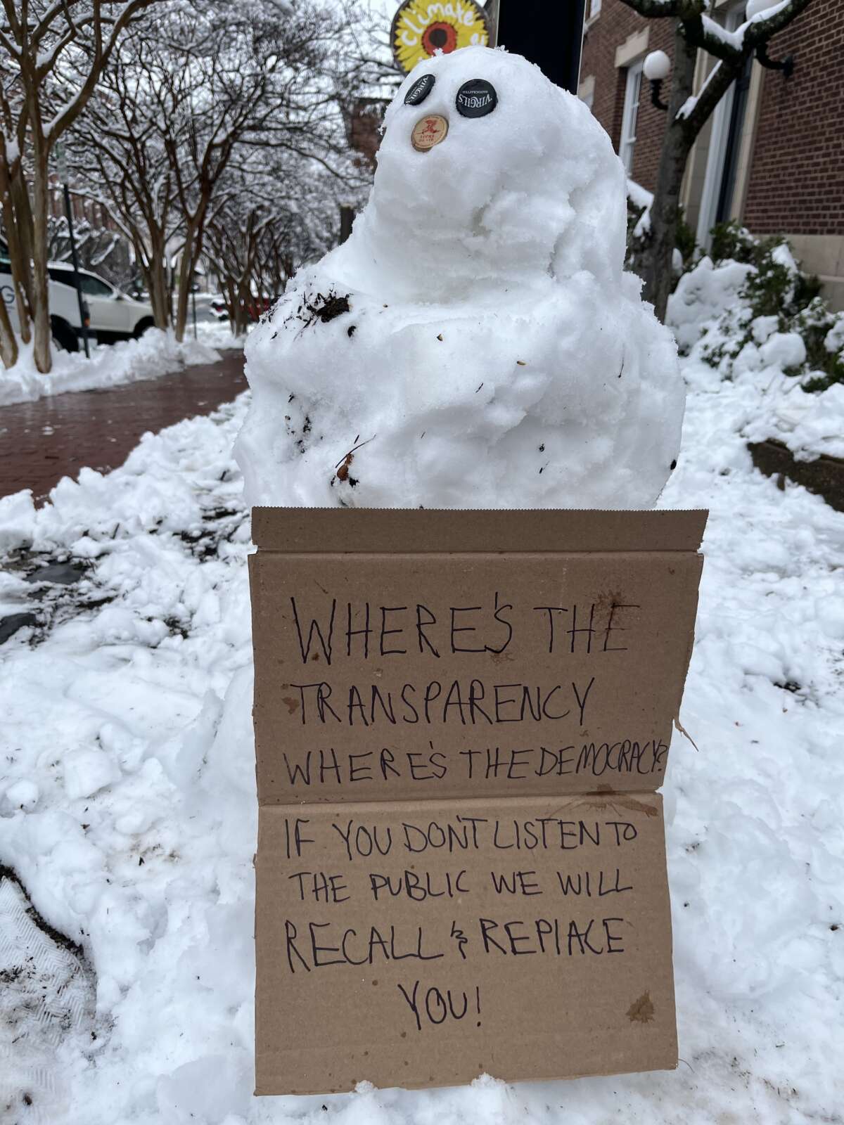 Organized by the Rappahannock Community Coalition, the “Snowmen Against Data Centers” rally took place just one day after nearly 10 inches of snow blanketed the region. The snowmen were erected on the Mary Washington University Campus, City Hall, and a house off Harrell Road in Stafford County.