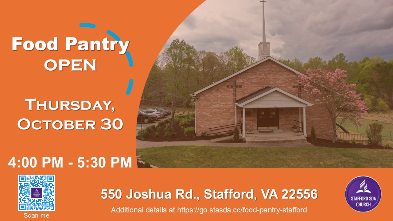 The church is hosting a Food Pantry Pop-up on Thursday, October 30, from 4:00 PM to 5:30 PM at 550 Joshua Rd., Stafford, VA 22556. Participants can drive through the parking lot to receive food packages. The list of needed food items is available here.