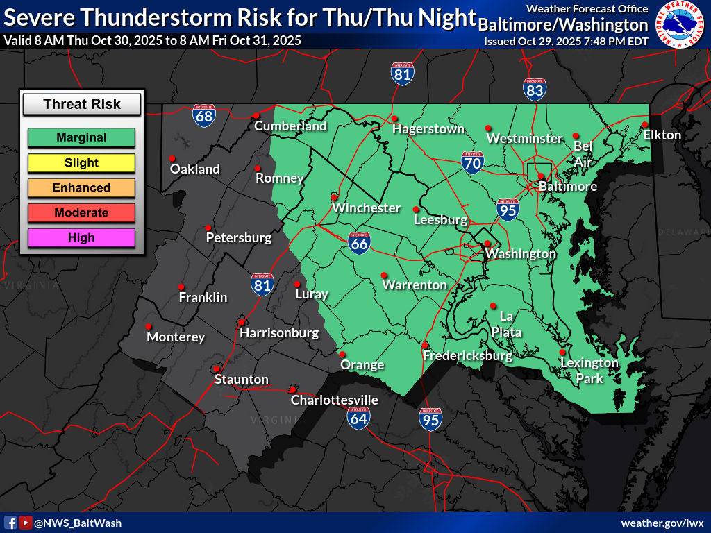 - Today: Rain and thunderstorms before 1 p.m., then a few lingering showers. High near 68. Southeast winds 10–15 mph becoming southwest and gusty.