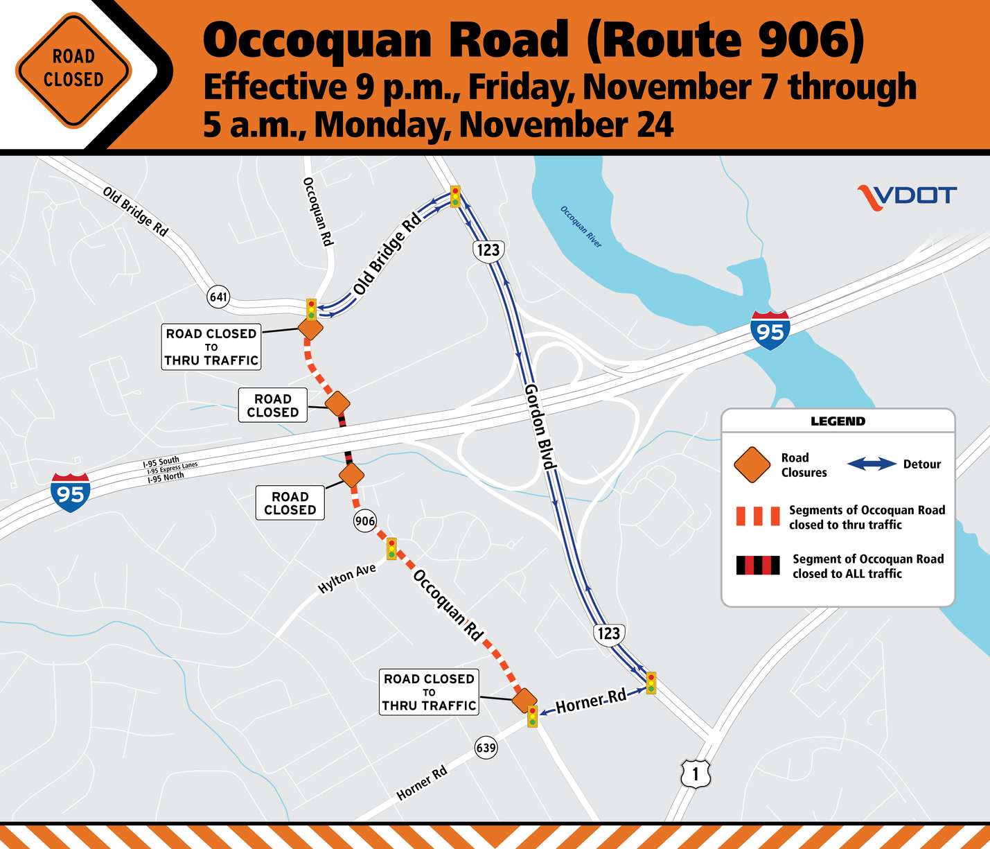 “Beginning at 9 p.m. Friday, Nov. 7, Occoquan Road (Route 906) between Horner Road (Route 639) and Old Bridge Road (Route 641) will be closed to through traffic for approximately two weeks,” the Virginia Department of Transportation announced. “The closure is required to lower Occoquan Road to maintain future bridge clearance as part of the I-95 and Route 123 interchange improvements project.”