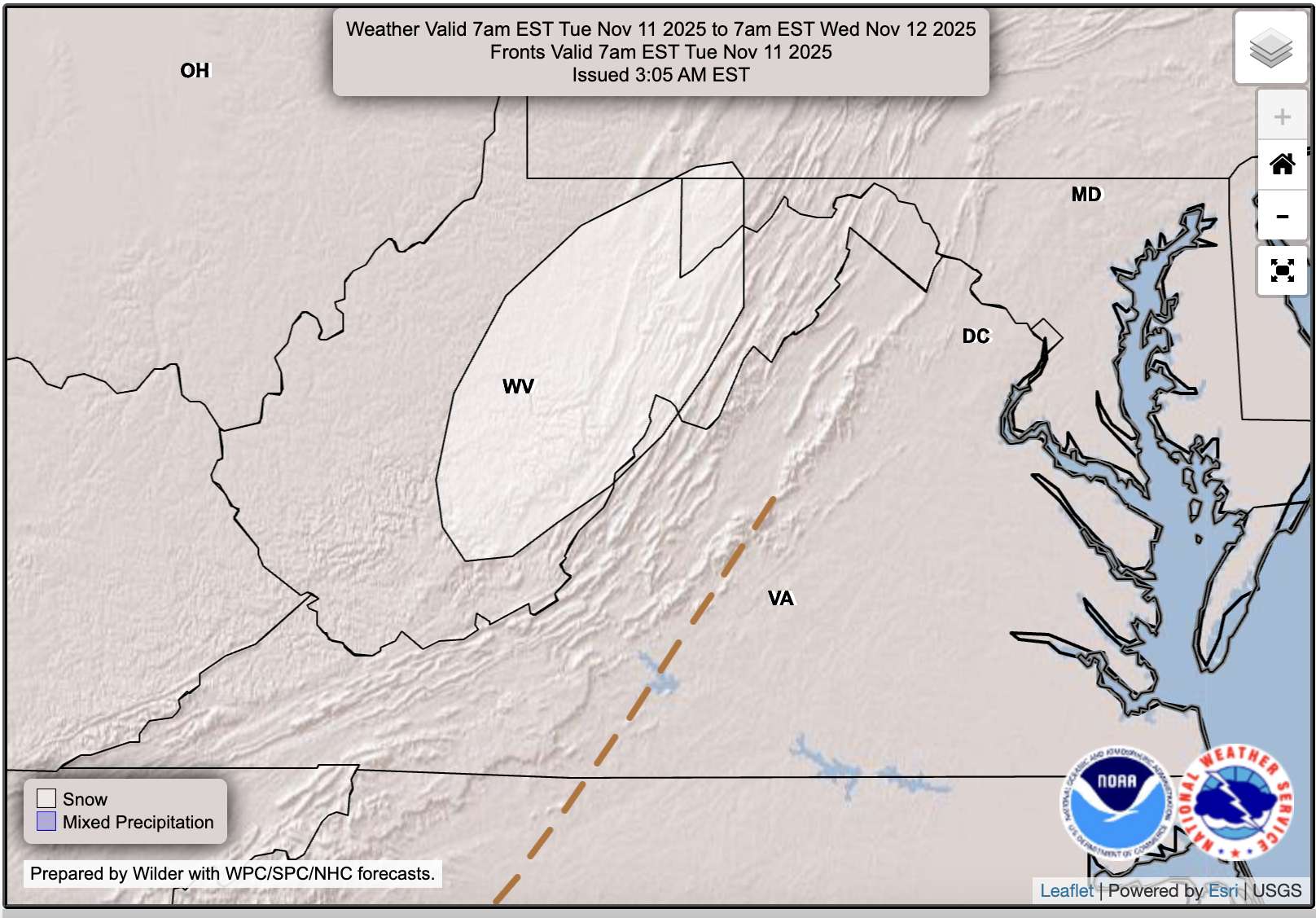 Light snow showers may brush far southern Maryland Monday night, while the mountains see additional snow accumulations.
