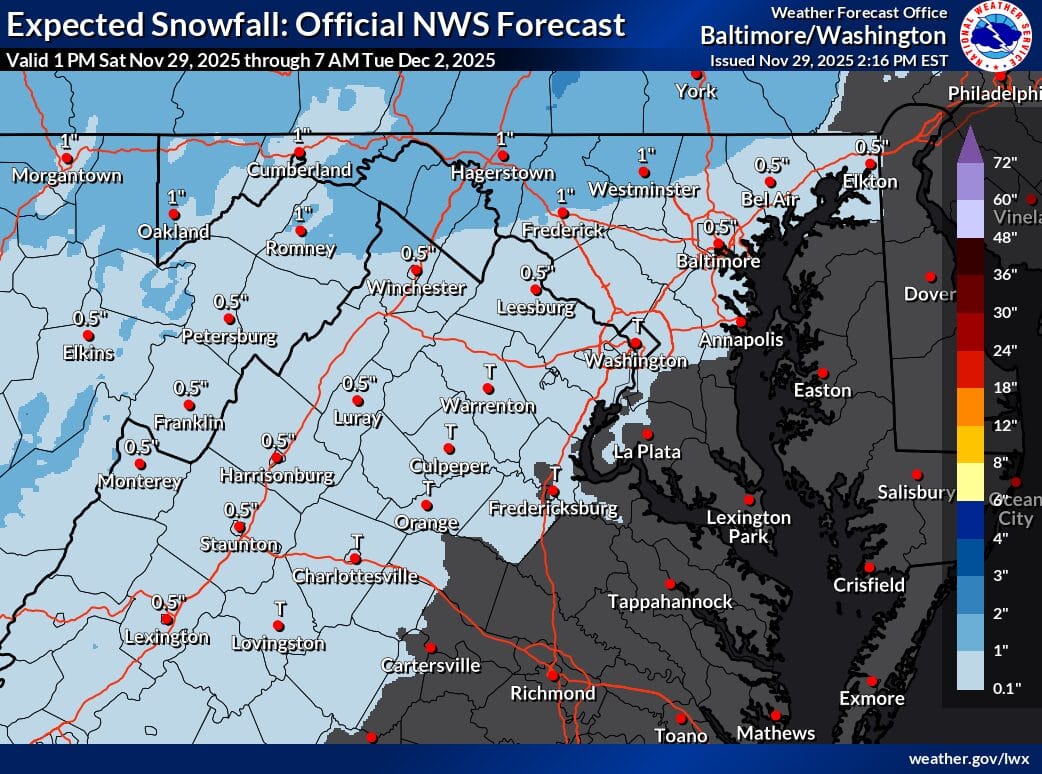Tuesday: Wintry mix begins 4–5 a.m., mainly west of the Blue Ridge; freezing rain possible. East of the Blue Ridge sees a brief mix, then cold rain. Evening clearing.