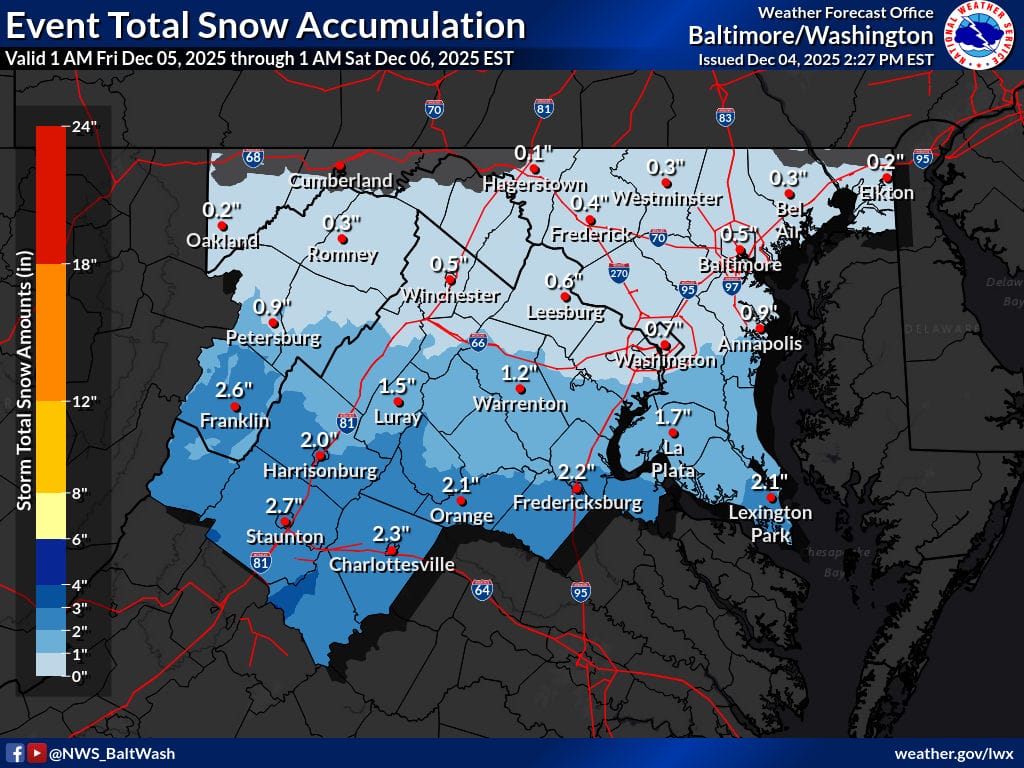 - Friday: Snow moves in early morning, tapering by late morning. A coating to 1″ for Stafford, Prince William, Fairfax; 1–2″ further south. Very hazardous commute. Freezing drizzle possible afternoon/evening.