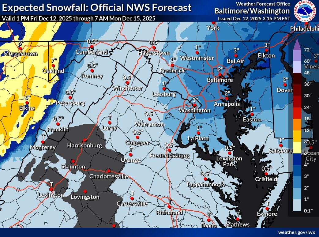 “Light snow showers could cause slippery road conditions in the Fredericksburg area, Northern Neck and Middle Peninsula over the weekend,” Virginia Department of Transportation announced. “Less than one inch of snow accumulation is forecast for most of the Fredericksburg area, with a potential for 1-2 inches of snow in northern Stafford County.”