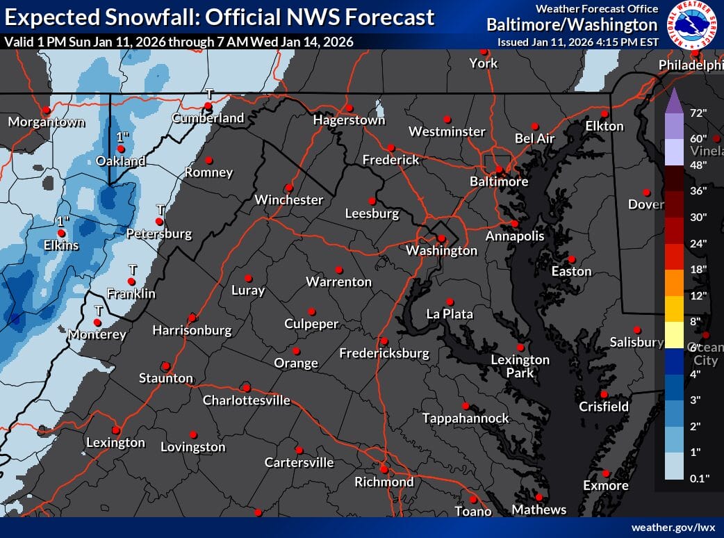As of Sunday, January 11, 2025, forecasters at the National Weather Service say the second half of the upcoming week and next weekend could bring multiple chances for wintry weather, especially for areas west of the Blue Ridge — with lower, but not zero, chances farther east.