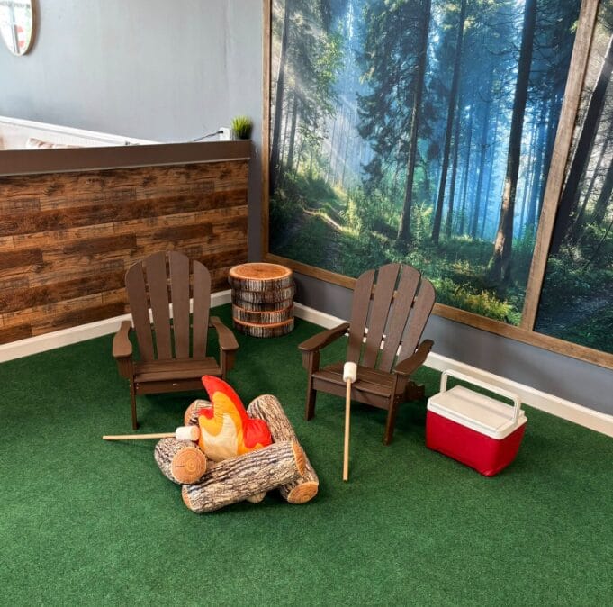 The village features several themed areas where children can role-play and explore imaginative play. The space is geared primarily toward preschool-aged children—Devine’s favorite age group to teach—but may also appeal to younger elementary-aged children. A thoughtfully designed seating area allows parents to connect with one another while maintaining full visibility of their children at play.