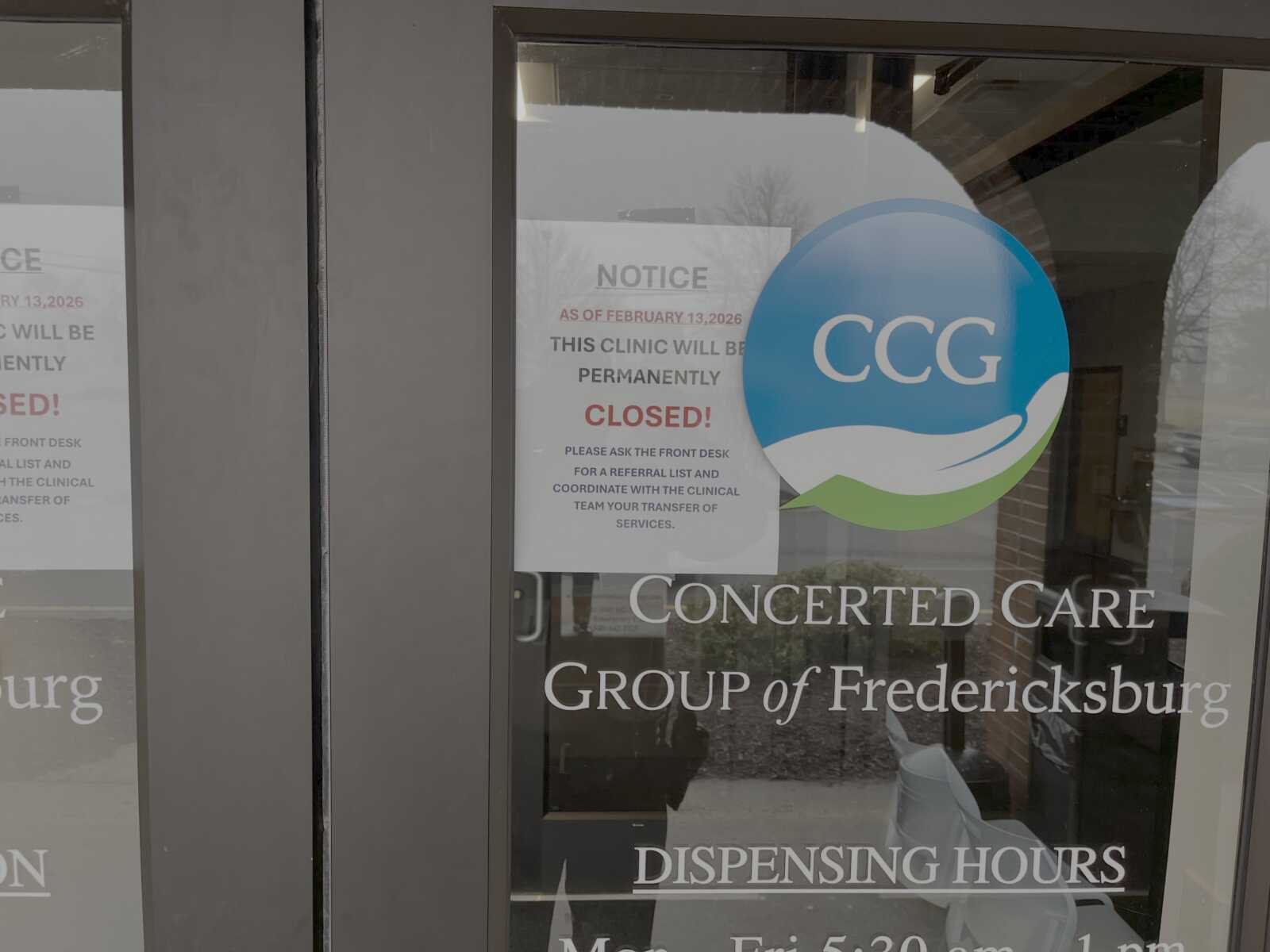 The Concerted Care Group (CCG) clinic in Stafford County, a key provider of opioid addiction treatment and behavioral health services, has abruptly closed its doors, according to a tip received by Potomac Local News today. Photos provided by the tipster show a permanent closure notice posted on the facility’s entrance, effective as of February 13, 2026, just weeks ago.