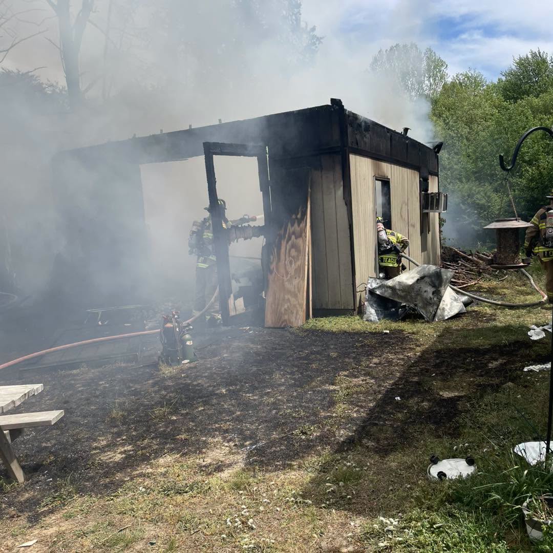 Firefighters extinguish a large shed fire in the 500 block of Sanford Drive near Greenbank Road on Saturday afternoon, April 18, 2026. The adjacent residence sustained some damage, but no one was hurt. (Stafford County Department of Fire and Rescue)