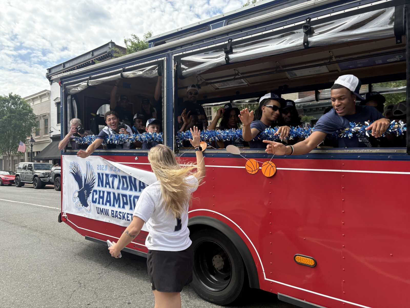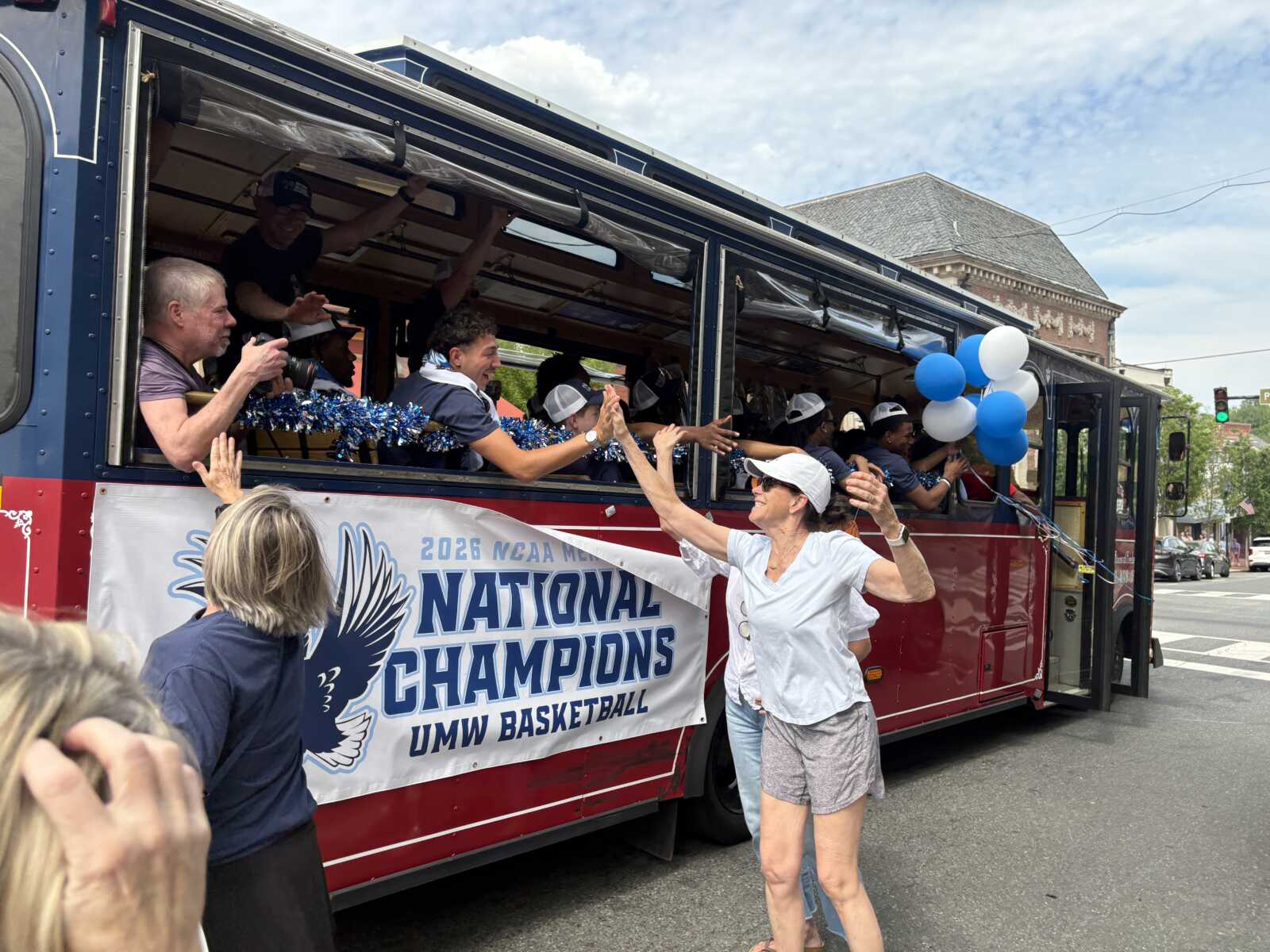 The City of Fredericksburg celebrated the University of Mary Washington’s national basketball championship with a drive-thru parade through downtown on Saturday, complete with blue and white balloons, smiling basketball players, and streets lined with enthusiastic onlookers.