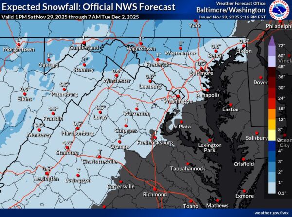 Precipitation is expected to begin before sunrise, with some areas seeing a quick burst of snow or sleet before changing over. East of the Blue Ridge, most places will turn to a cold rain shortly after onset. Conditions dry out Tuesday night as high pressure returns, leading to several cold days ahead.