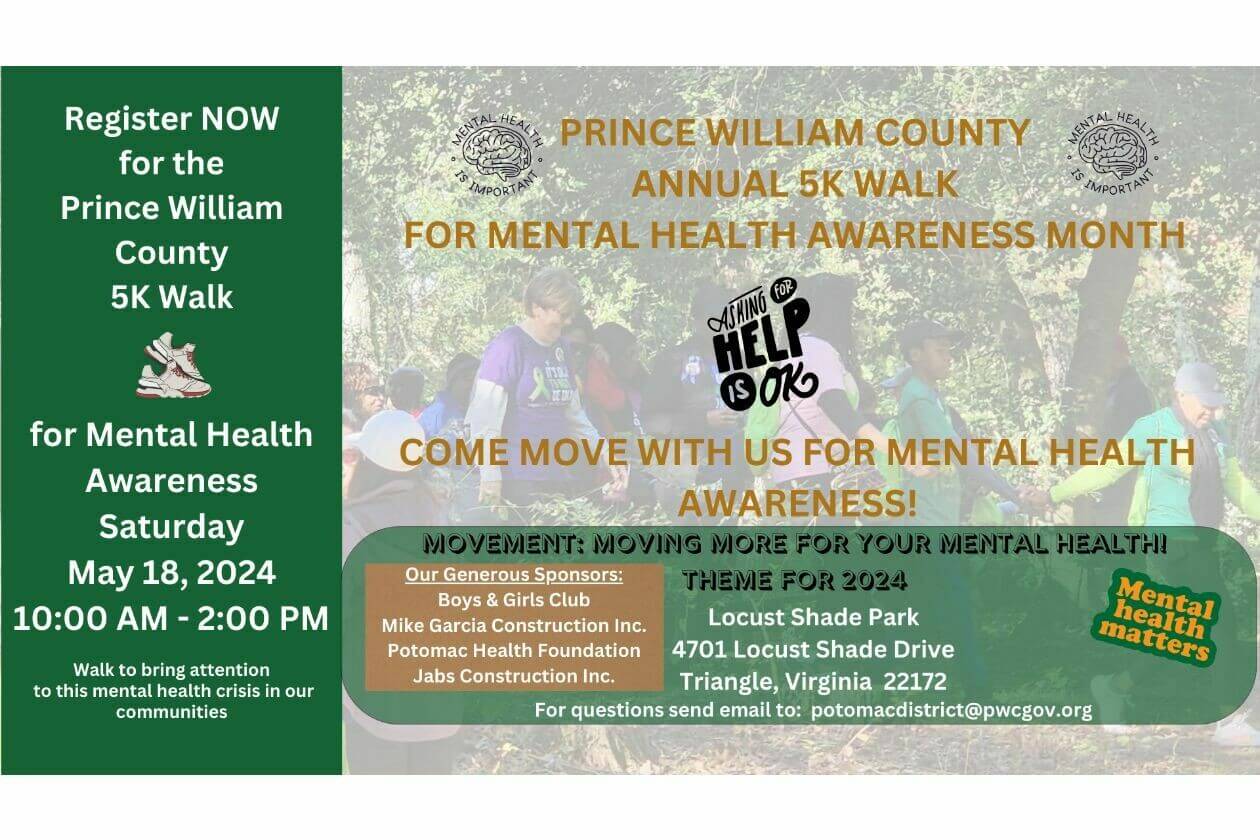 We are honored to have the Honorable Andrea O. Bailey of the Potomac District, along with the esteemed leadership of Prince William County, hosting our 4th Annual 5K Walk for Mental Health Awareness. This event is a testament to their commitment to educate, advocate for, and dispel myths and stigma surrounding mental illness.