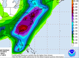 As Tropical Storm Andrea approaches, the map with forecast rain totals for Virginia tells a story of this early season storm.
