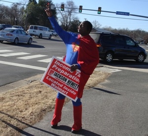 He stood shouting at passersby on Saturday as part of a gimmick for a national tax preparation service.