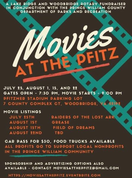 The idea, called ‘Movies at the Pfitz,’ was conceived by Ben Hazekamp, a financial advisor, and Valerie Meale, a business development manager at Whitlock Wealth Management in Lake Ridge. They contacted Seth Hendler-Voss, Director of Prince William County Parks and Recreation, who supported the idea and aided in making it possible.