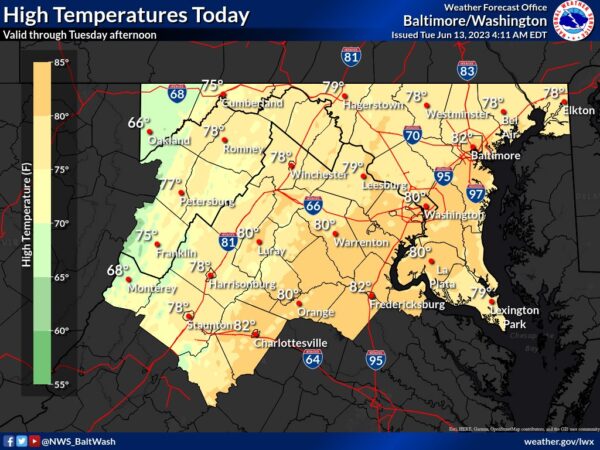 “Today: Mostly sunny, with a high near 83. West wind 5 to 8 mph becoming southwest in the afternoon.”
