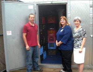 ACTS Food Pantry Coordinator Mike Hinz, BJs Personnel Manager Karen Dewland and ACTS Executive Director Francis Harris show off the new refrigerator.