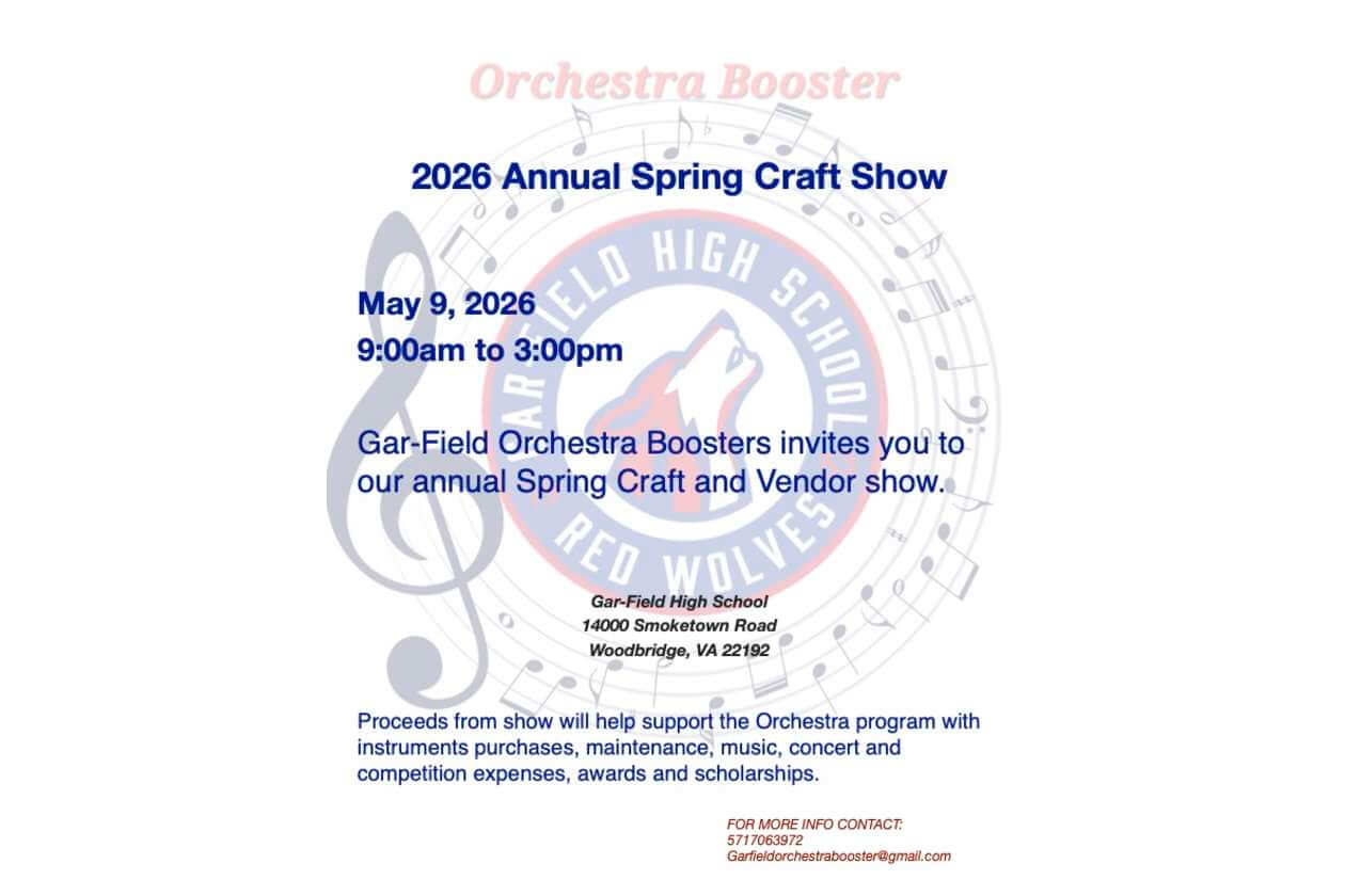 Gar-Field Orchestra Booster invites you to our annual Spring Craft and Vendor show on May 9, 2026 from 9am to 3pm.