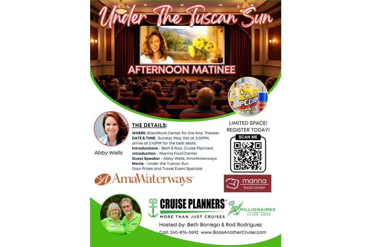 Join us for a delightful Sunday afternoon at the BlackRock Center for the Arts as Cruise Planners Beth & Rod present a special travel-inspired matinee featuring the beloved film Under the Tuscan Sun.