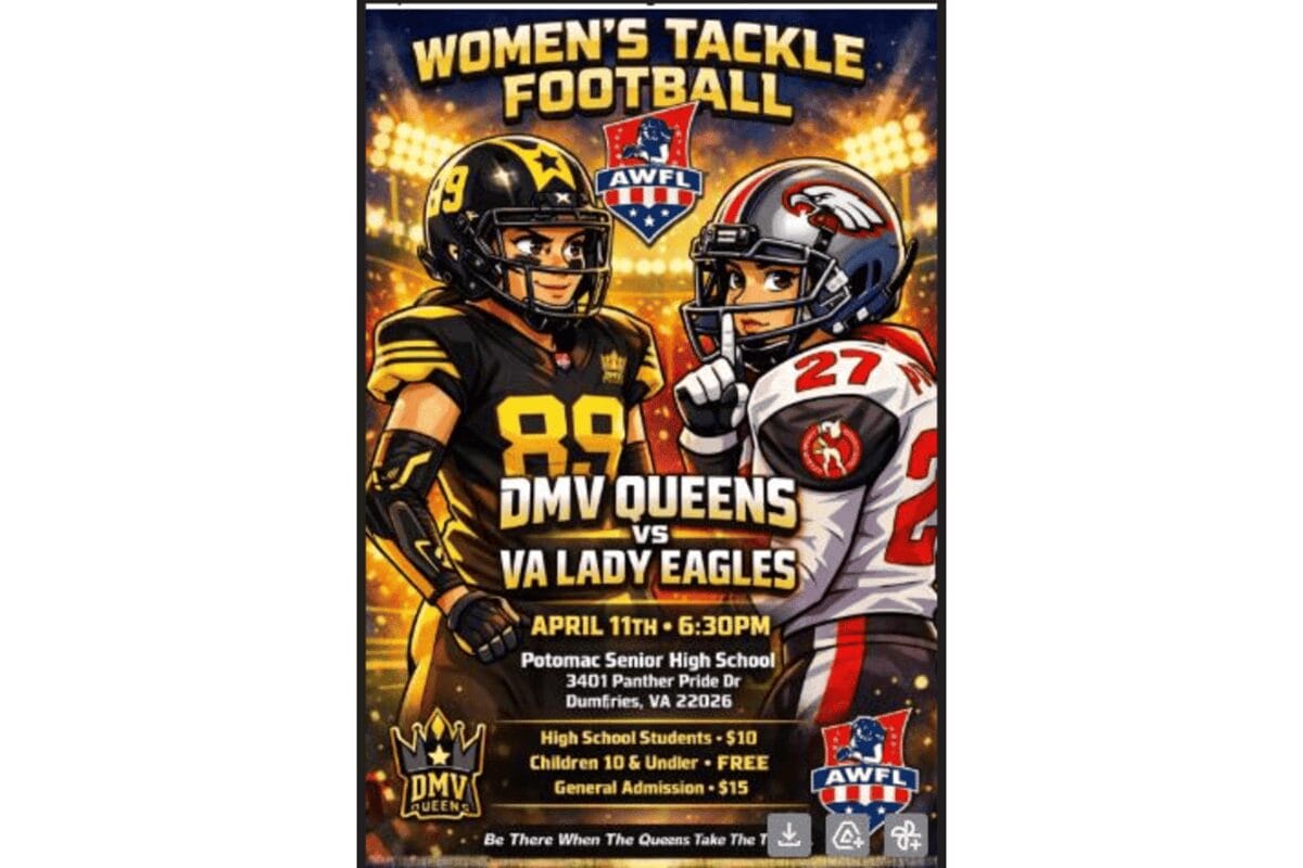 Event April 11, 2026 6:30 pm -9:30 pm Gridiron Queens on the Potomac Potomac Senior High School 3401 Panther Pride Dr Dumfries, Virginia 22026 Contact Social AWFL DMV Queens Womans Tackle vs AWFL VA Lady Eagles Back to Calendar