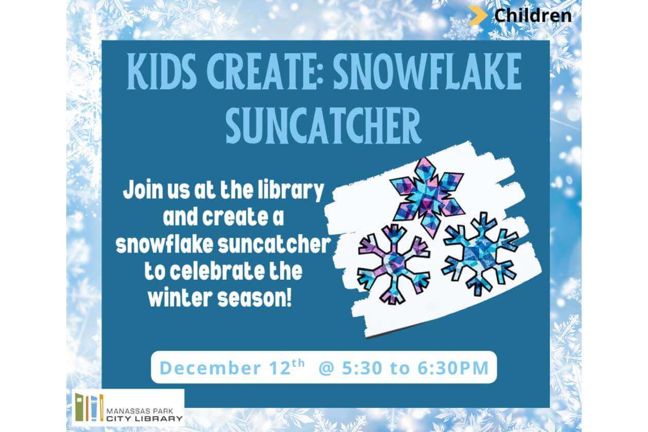 Event December 12, 2025 5:30 pm -6:30 pm Kids Create: Snowflake Suncatcher Manassas Park City Library 100 Park Central Plaza Manassas Park, Virginia 20111 Website Social Join us at the library as we create a snowflake suncatcher to celebrate the winter season! Back to Calendar