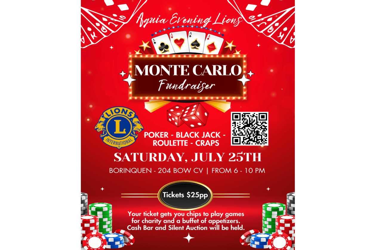 Join us for a Monte Carlo-style casino night — poker, blackjack, roulette, craps, silent auction, buffet, and a cash bar. Tickets $25 — chips for charity. 6–10 PM at Borinquen, 204 Bow Ct. An evening of casino-style fun (no cash gambling) with appetizers, auction, and community spirit.