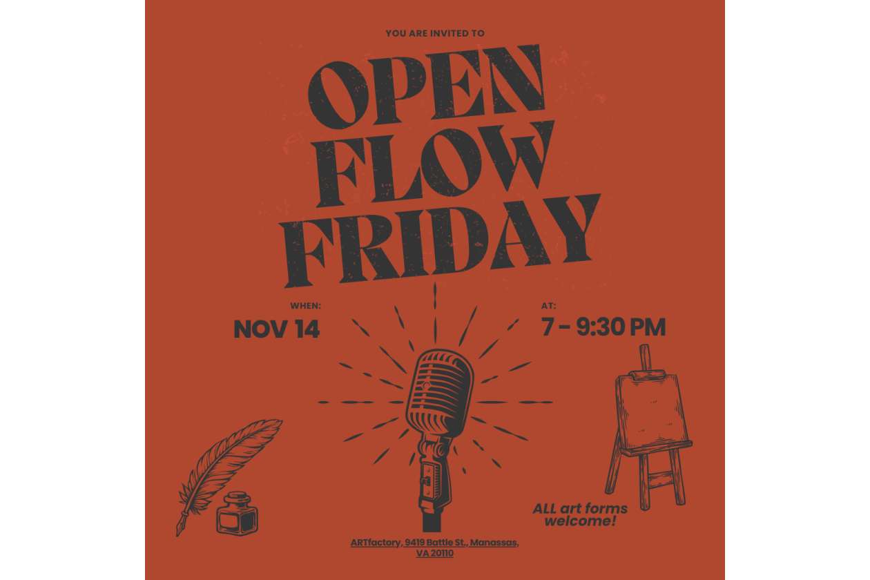 We invite you to join us for ARTfactory’s “Open Flow Friday” event on Friday, November 14 from 7 to 9:30 pm in the art gallery (1st floor)! Open Flow Friday applies a creative spin to the “open mic night” concept, additionally encouraging ALL types of creatives to participate, present, and/or perform their craft! Open Flow Friday offers an open mic, and open art demonstration space for local artists to share their art form with an audience, whether you are a poet, author, musician, artist, etc. This is your safe space for creativity, community, and self-expression! This event is free and open to the public.