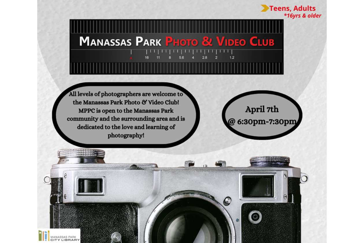 Event April 7, 2026 6:30 pm -7:30 pm Photography and Video Club Manassas Park City Library 100 Park Central Plaza Manassas Park, Virginia 20111 Website Social Join us for our monthly Photo & Video Club! 16 years and older Back to Calendar