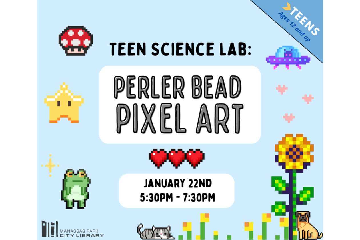 Event January 22, 2026 5:30 pm -7:30 pm Teens Science Lab: Perler Bead Pixel Art Manassas Park City Library 100 Park Central Plaza Manassas Park, Virginia 20111 Website Social Make a fun piece of pixel art out of perler beads, and learn the science behind how they work! 12yrs and older Back to Calendar